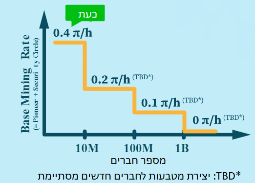 הגרף הבא מראה כי קצב הכרייה יורד ככל שמצטרפים חברים חדשים למיזם מטבע פאי. אם בשנת 2020 כורה מתחיל כרה בקצב של 0.4 פאי לשעה הרי שבסוף 2020 כשמספר הכורים הגיע ל-10 מיליון, קצב הכרייה הואט ל-0.2 פאי לשעה וכן הלאה… זו הסיבה שכדאי להצטרך כבר היום לפרוייקט פאי. אפשר להוריד את האפליקציה כאן.