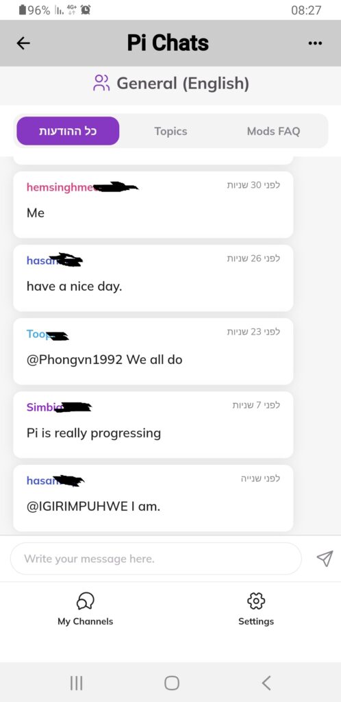תשתית הצ'אטים של פאי נטוורק עודכנה בהצלחה בשבוע שעבר. העדכון יאפשר לאפליקציית הצ'אטים פיתוח תכוף יותר של תכונות חדשות ותמיכה בריבוי משתמשים. לצד העדכון, הוכנסו לצ'אטים גם מראה וסטייל רעננים. הקישו על "Chat" באפליקציה כדי להתחבר לחלוצים אחרים. הנה המראה החדש של הצ'ט הראשי של פאי.